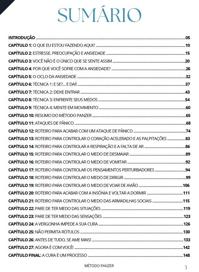O Método Panzer é um guia completo para acabar com a ansiedade e ataques de pânico dividido por capítulos e etapas. Você acessará a plataforma online e começará imediatamente a estudar as técnicas e aplicar e em poucos dias verá a ansiedade e ataques de pânico sumirem por completo.